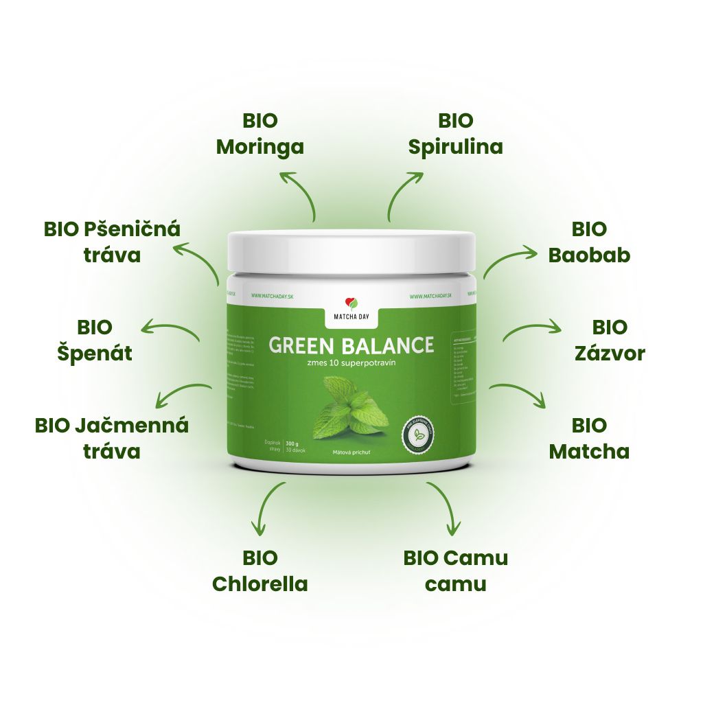 Green Balance je starostlivo navrhnutý super greens produkt, ktorý kombinuje viacero silných superpotravín do jednej vyváženej receptúry. Zmes obsahuje bio prášok z moringy, bio pšeničnú trávu, bio spirulinu, bio špenát, bio baobab, bio jačmennú trávu, bio chlorellu, bio matcha prášok, bio zázvor a bio camu camu, ktoré patria medzi najbohatšie prírodné zdroje vitamínov, minerálov a antioxidantov.