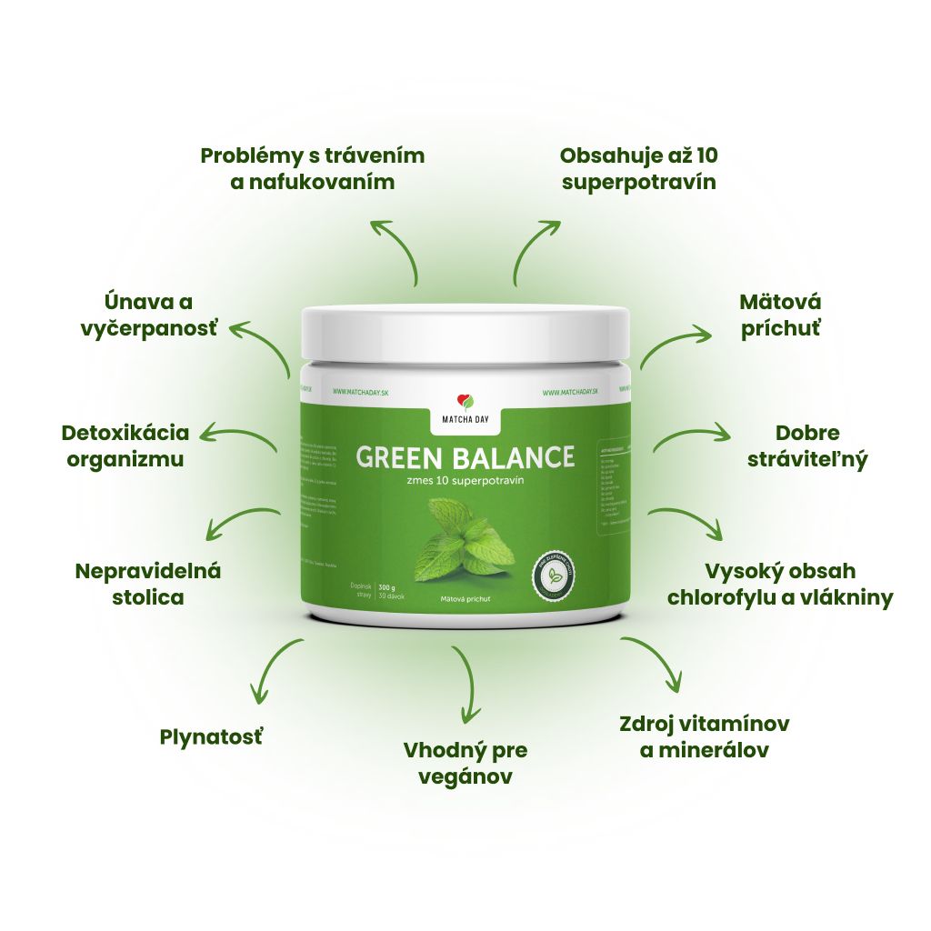 Green Balance obsahuje kombináciu zelených superpotravín, vlákniny a chlorofylu, ktoré podporujú správnu činnosť tráviaceho systému. Zmes môže pomôcť pri problémoch ako plynatosť, pocit ťažkého žalúdka či nepravidelná stolica a zároveň podporuje prirodzené prečistenie čriev.