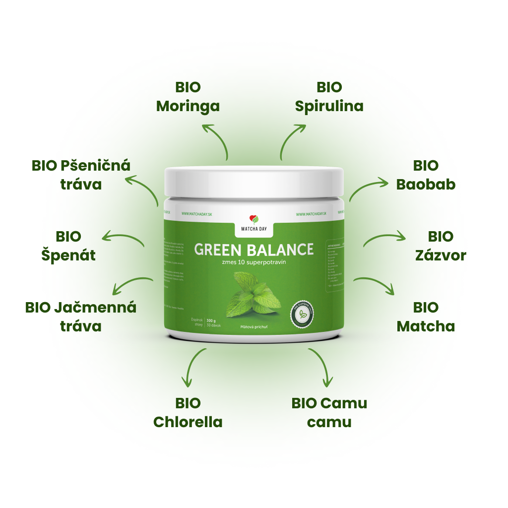 Green Balance je práškový nápoj zo zmesi 10 bio superpotravín, ktoré podporujú prirodzenú detoxikáciu organizmu, trávenie a celkovú vitalitu. Kombinuje zelené rastliny, riasy a prírodný vitamín C, čím pomáha doplniť telu dôležité živiny a podporiť prirodzené očistné procesy organizmu.