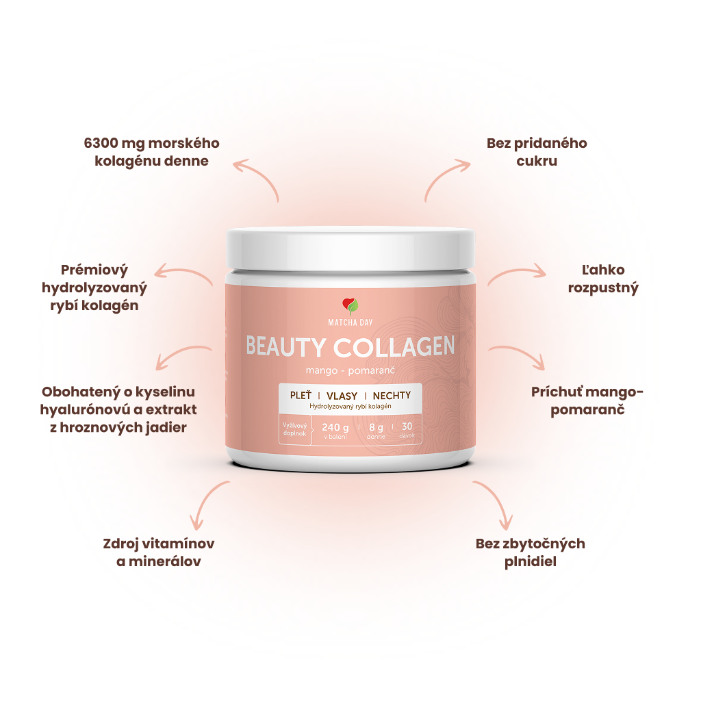 Beauty kolagén obsahuje hydrolyzovaný rybí kolagén v silnej dennej dávke až 6300 mg, ktorý je doplnený o kyselinu hyalurónovú, extrakt z hroznových jadier, vitamíny a minerály dôležité pre krásu pokožky, vlasov a nechtov. Náš kolagén je obohatený o vitamín C, ktorý prispieva k tvorbe kolagénu v tele a podporuje jeho lepšiu vstrebateľnosť a využiteľnosť. Formula je zároveň bez pridaného cukru a má príjemnú ovocnú príchuť mango – pomaranč.