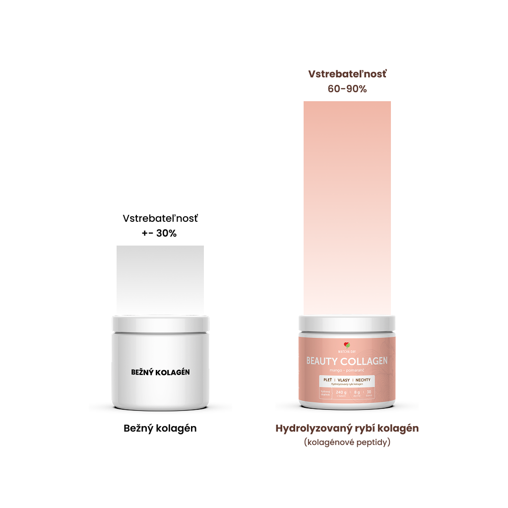 Hydrolyzovaný kolagén obsahuje malé kolagénové peptidy, ktoré majú výrazne vyššiu biologickú dostupnosť. Výskumy ukazujú, že bežný kolagén sa vstrebáva približne na úrovni okolo 40 %, zatiaľ čo hydrolyzované kolagénové peptidy môžu dosahovať využiteľnosť až 60–90 %.