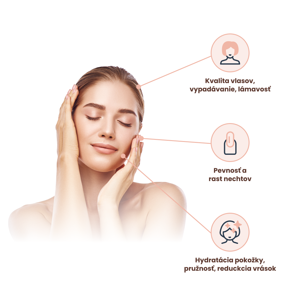 Komplexná receptúra je doplnená o kyselinu hyalurónovú, vitamíny a minerály, ktoré podporujú tvorbu kolagénu, hydratáciu pokožky a ochranu buniek pred oxidačným stresom.Podpora zdravia vlasov, nechtov a pokožky
